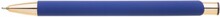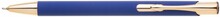 Kovová středně modrá propiska s pogumovaným povrchem a zlatými doplňky, s efektem laseru v lesklé zlaté barvě. Náplň velkoobsahová semigelová.