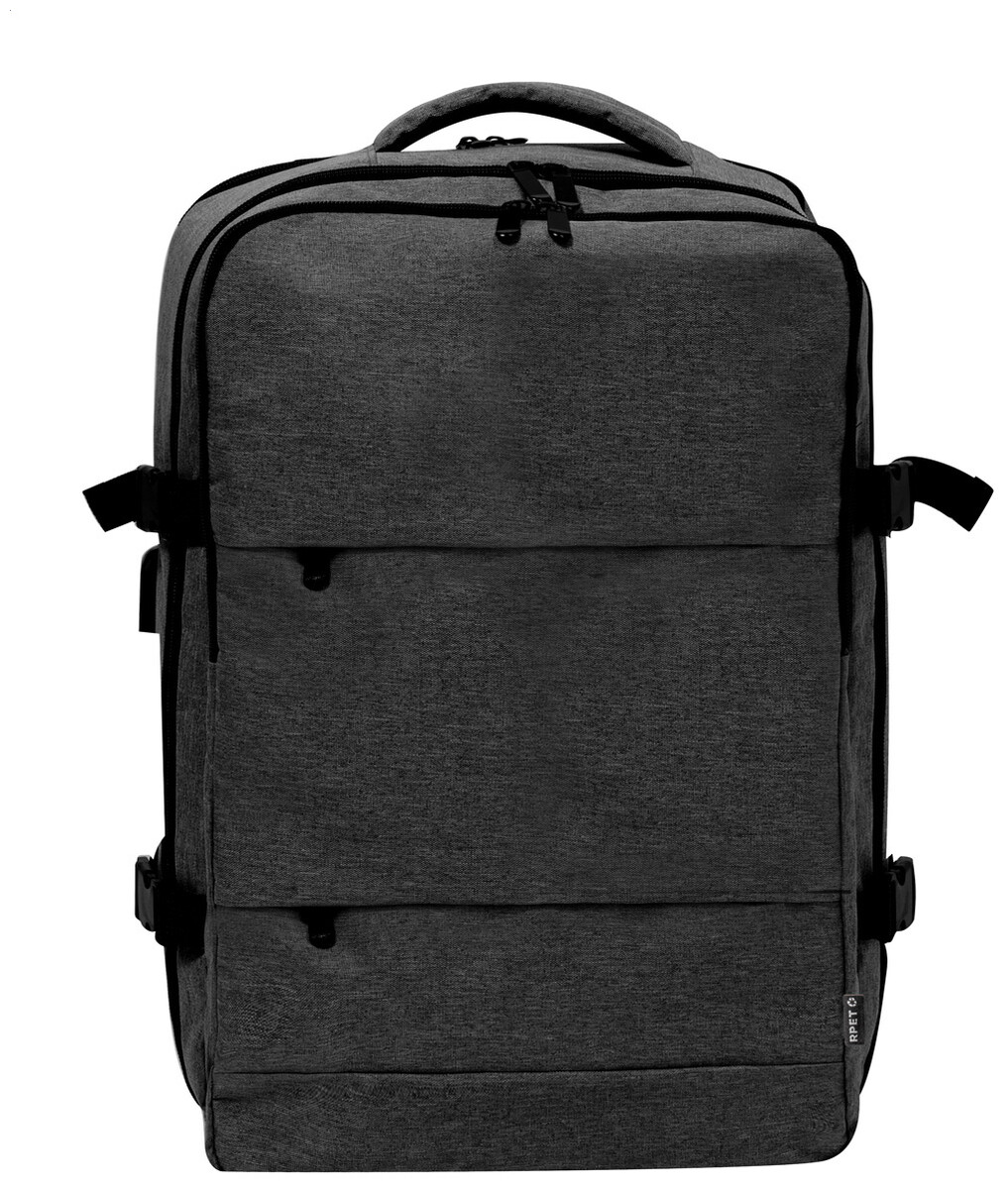 Voděodolný RPET batoh se 3 hlavními přihrádkami na zip, 2 předními kapsami na zip, boční kapsou na zip a skrytou kapsou proti krádeži. S polstrovanými přihrádkami na notebook (17") a botami, polstrovanými zády a ramenními popruhy. S popruhem na vozík a vestavěným USB připojením pro powerbanky. Polyester 300D RPET s výrazným štítkem RPET.