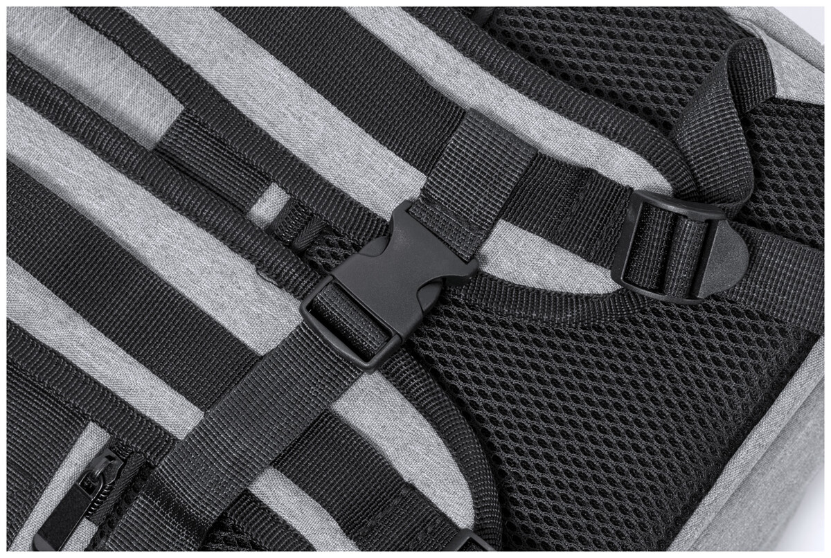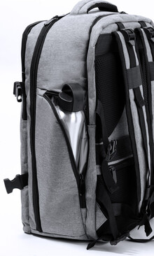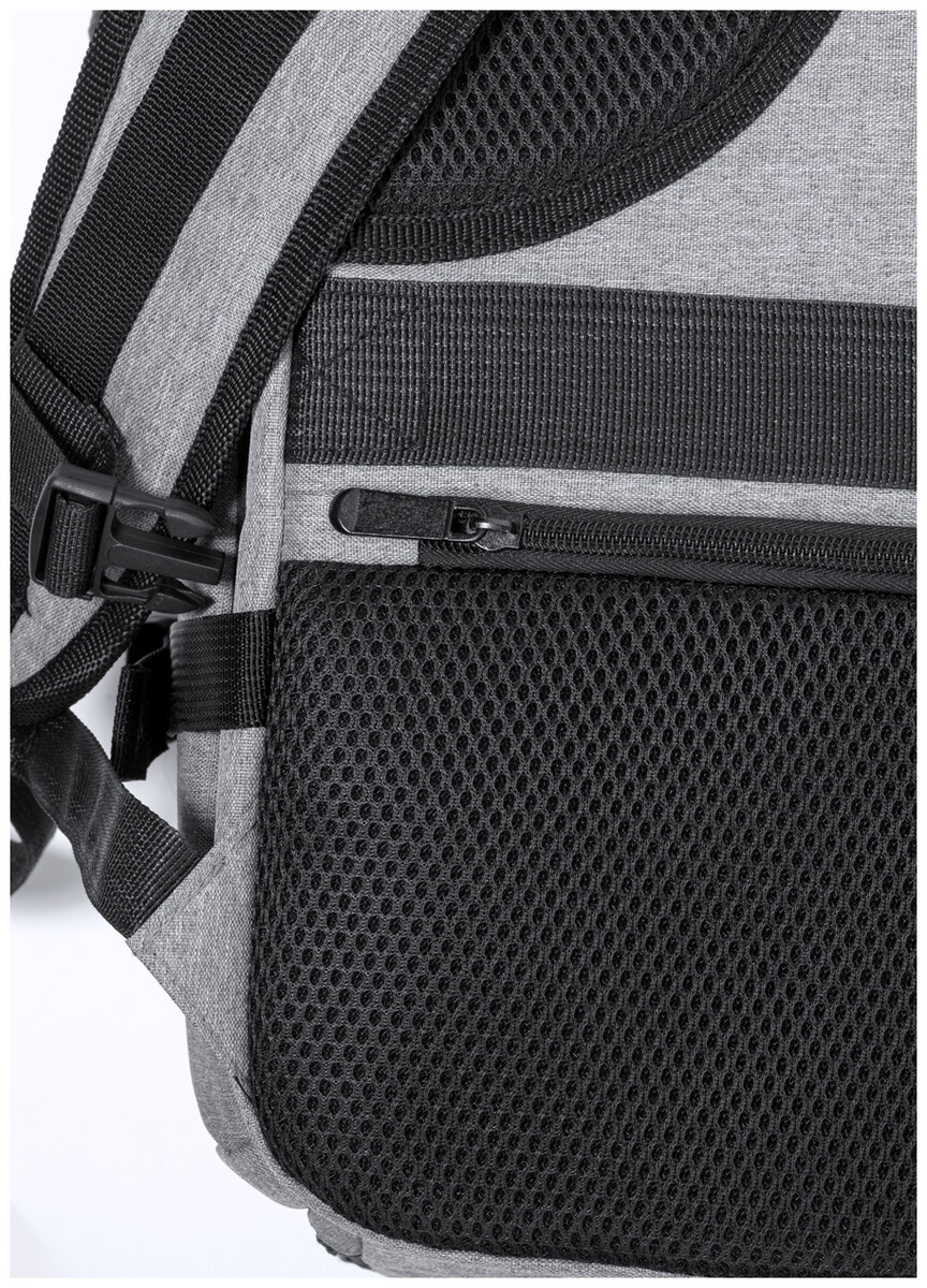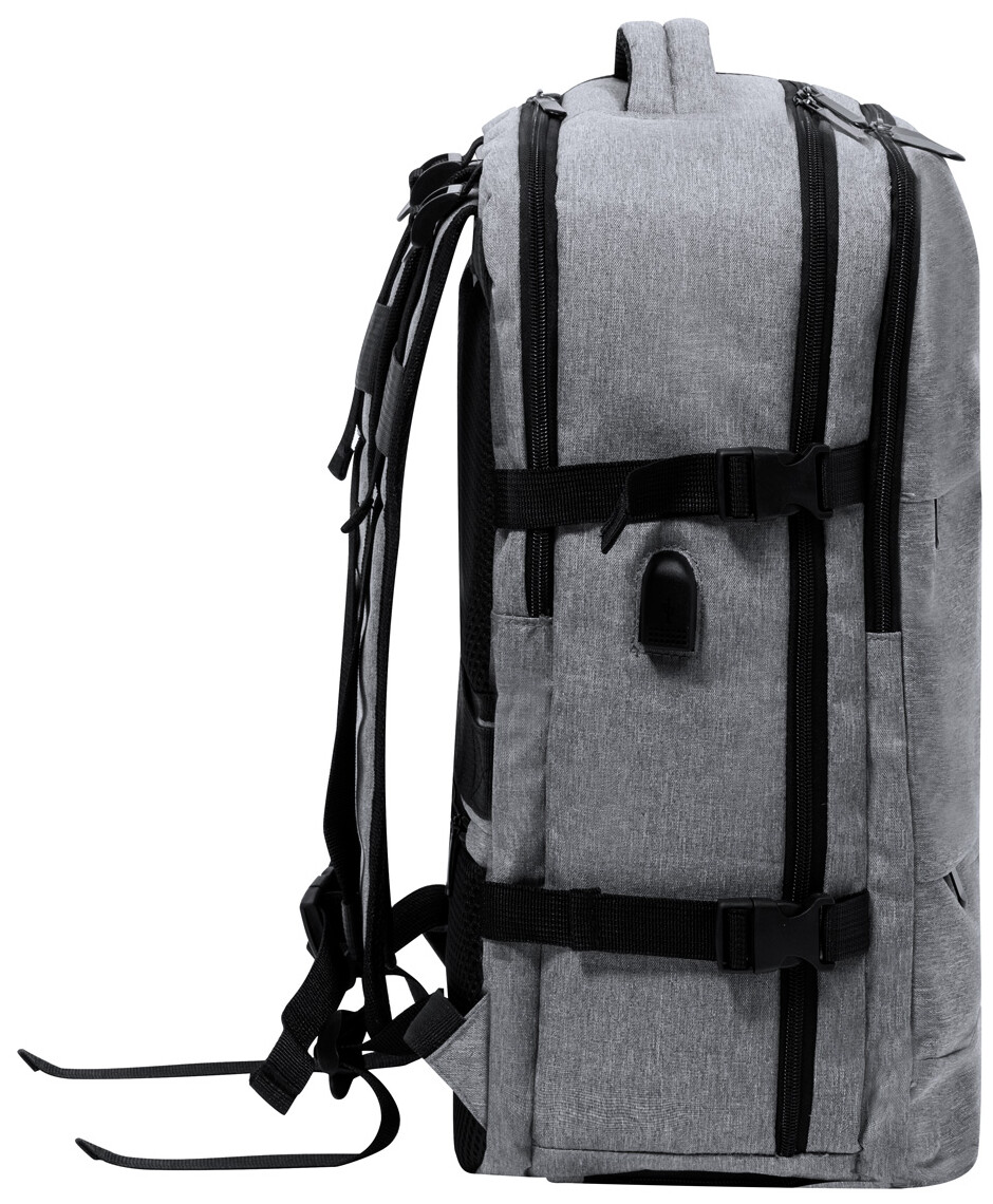 Voděodolný RPET batoh se 3 hlavními přihrádkami na zip, 2 předními kapsami na zip, boční kapsou na zip a skrytou kapsou proti krádeži. S polstrovanými přihrádkami na notebook (17") a botami, polstrovanými zády a ramenními popruhy. S popruhem na vozík a vestavěným USB připojením pro powerbanky. Polyester 300D RPET s výrazným štítkem RPET.