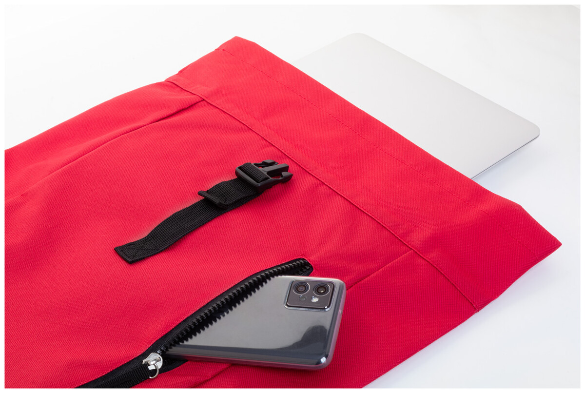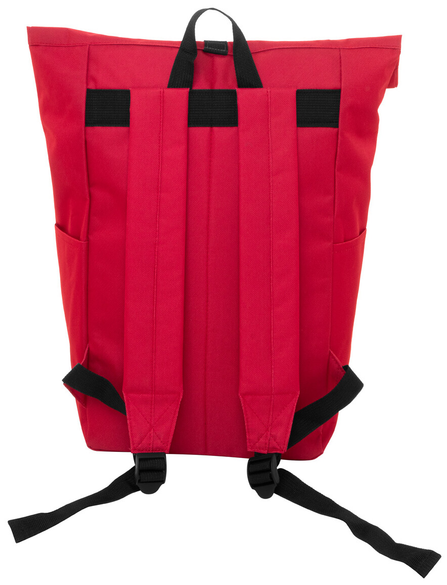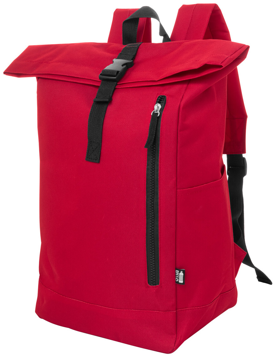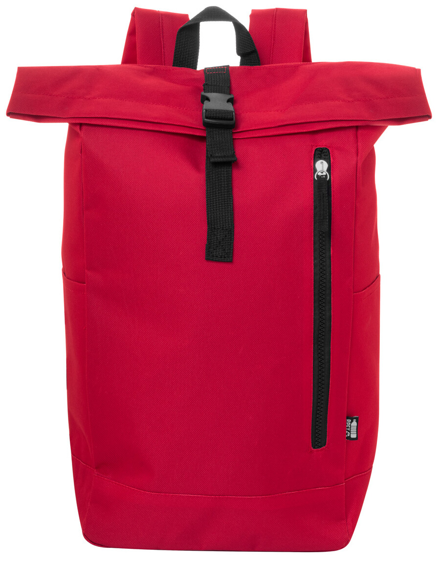 Rolovací batoh RPET se zapínáním na přezku, přihrádkou na notebook (14") a přední kapsou na zip. S polstrovanými zády a ramenními popruhy. Polyester 600D RPET s výrazným štítkem RPET.