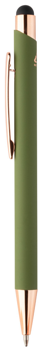 Kuličkové a dotykové pero z recyklovaného hliníku s pogumovaným povrchem a detaily v barvě růžového zlata. Se speciální povrchovou úpravou pro zrcadlové laserové gravírování v barvě růžového zlata. S modrou náplní.
