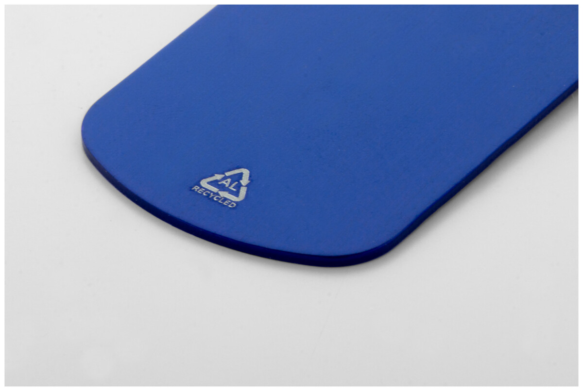 Přívěšek na klíče z recyklovaného hliníku s kovovým kroužkem.