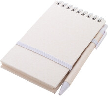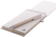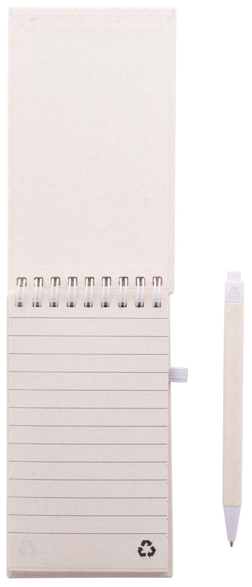 Spirálový blok A6 s deskami z recyklovaného z kartonu na mléko s pevnou vazbou a 70 linkovanými listy. Se spirálovými kroužky ve stejné barvě, gumičkou a poutkem na pero. Včetně recyklovaného kartonového papíru na mléko a recyklovaného ABS plastového kuličkového pera s modrou náplní.