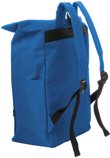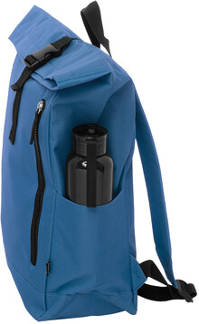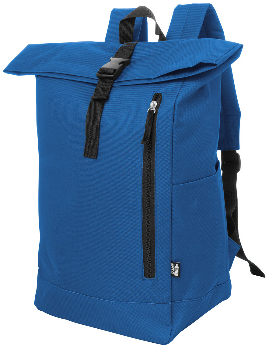 Rolovací batoh RPET se zapínáním na přezku, přihrádkou na notebook (14") a přední kapsou na zip. S polstrovanými zády a ramenními popruhy. Polyester 600D RPET s výrazným štítkem RPET.