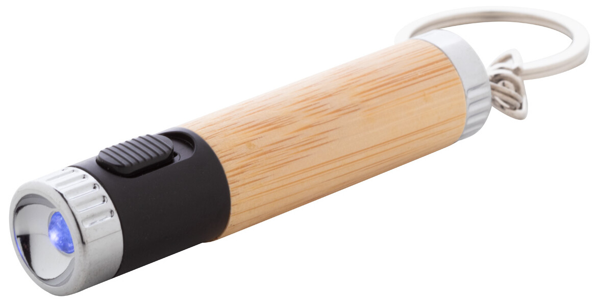 Mini svítilna z bambusu a recyklovaného ABS plastu s 1 LED a kovovým kroužkem na klíče. S knoflíkovou baterií.