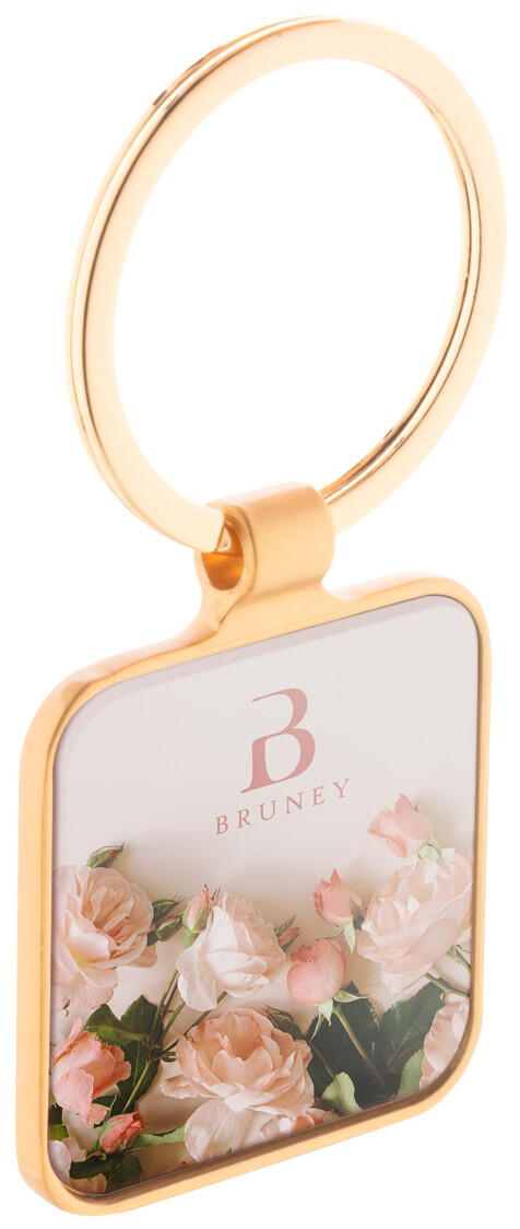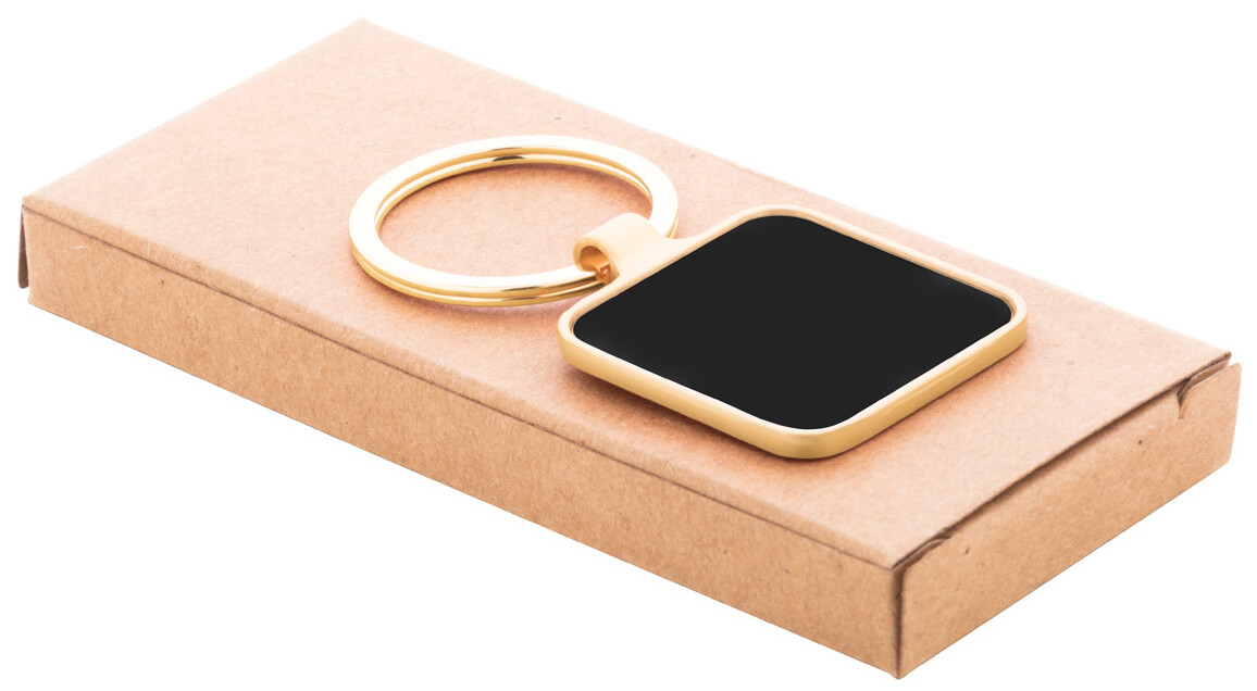 Kovový přívěsek na klíče čtvercového tvaru ve zlatém provedení s bronzovou destičkou. V kraftové papírové krabici.