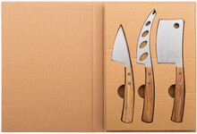 3dílná sada nožů na sýr z nerezové oceli s rukojetí z akáciového dřeva. V krabičce ve tvaru knihy z kraftového papíru.