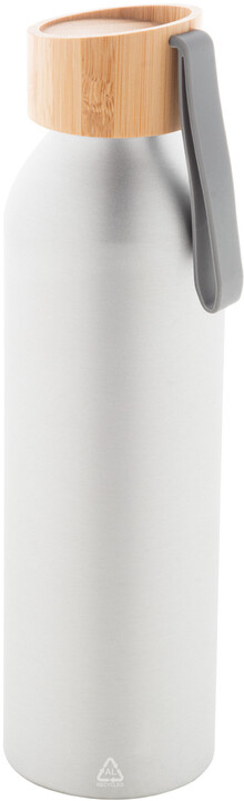 Láhev z recyklovaného hliníku s bambusovým víčkem a silikonovým popruhem v odpovídající barvě, 600 ml.