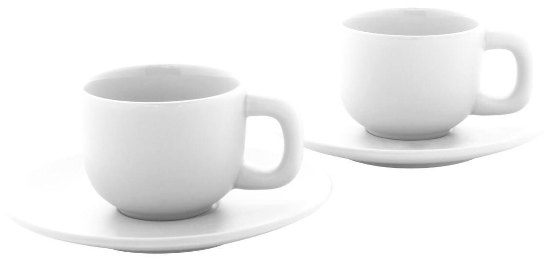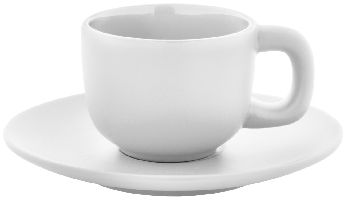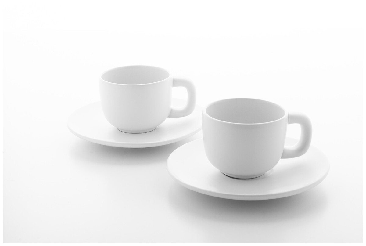 Vysoce kvalitní sada keramických šálků na espresso se 2 šálky a podšálky. S matnou vnější a lesklou vnitřní povrchovou úpravou. 85 ml. V kraftové papírové krabici.