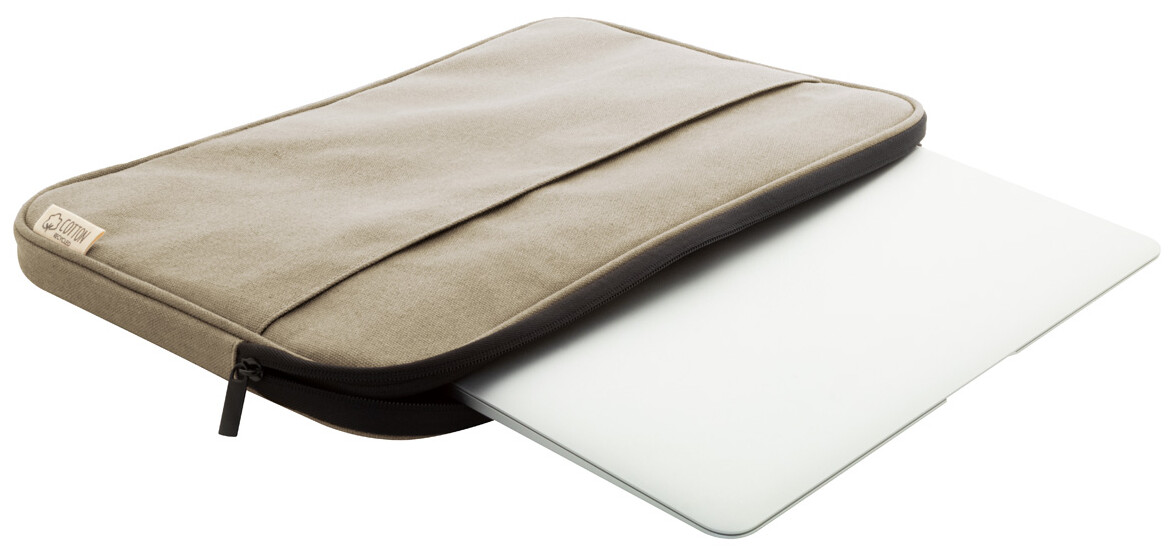 Plně polstrovaná taška na notebook z recyklovaného plátna s přihrádkou na zip a přední kapsou. Vhodné pro notebooky do 15". 70% recyklované bavlny a 30% RPET polyesteru. S výrazným štítkem z recyklované bavlny.