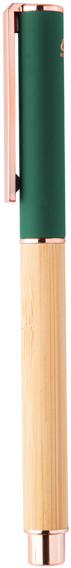 Roller pero z bambusu a recyklovaného hliníku s pogumovaným uzávěrem a detaily z růžového zlata. Se speciální povrchovou úpravou pro zrcadlové laserové gravírování v barvě růžového zlata. S modrou náplní.
