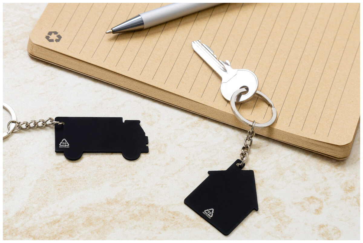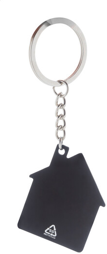 Přívěšek na klíče z recyklované nerezové oceli ve tvaru domečku s pogumovaným povrchem. Se speciální vrstvou pro zrcadlové laserové gravírování.