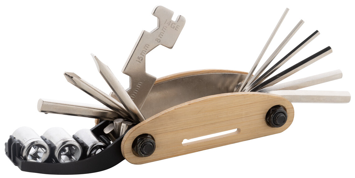 Multifunkční nářadí z nerezové oceli s bambusovou rukojetí a 14 funkcemi. Obsahuje ploché a křížové šroubováky, 5 šestihranných klíčů, 3 nástrčné klíče s prodlužovací lištou a 4 ploché klíče.