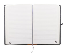 Blok A5 potažený polyesterem RPET s hřbetem z přírodního korku a 80 linkovanými listy z recyklovaného papíru. Se záložkou, gumovým páskem a držákem na pero.