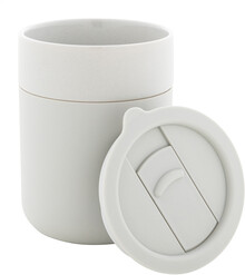 Silikonem potažený keramický cestovní kelímek s PP plastovým odkapávacím víčkem. 300 ml.