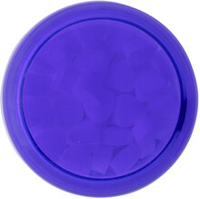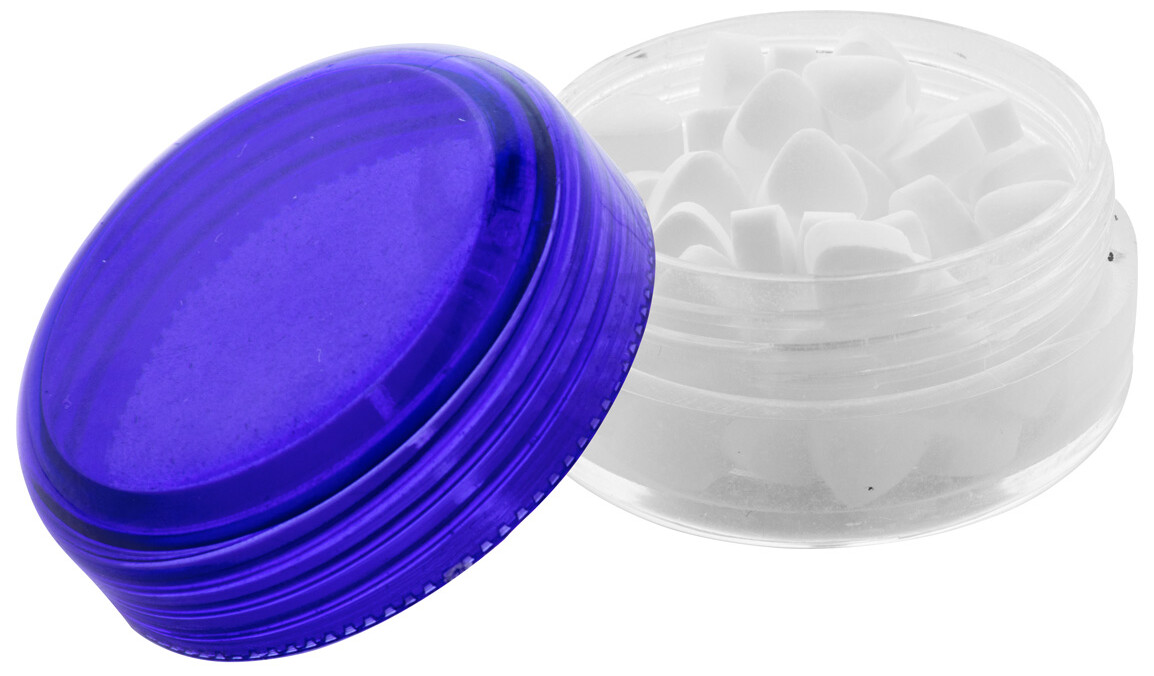 Kulatá průhledná plastová dóza s mintovými bonbóny s barevným šroubovacím víčkem. Obsahující cca. 12 gramů mentolových bonbonů bez cukru.