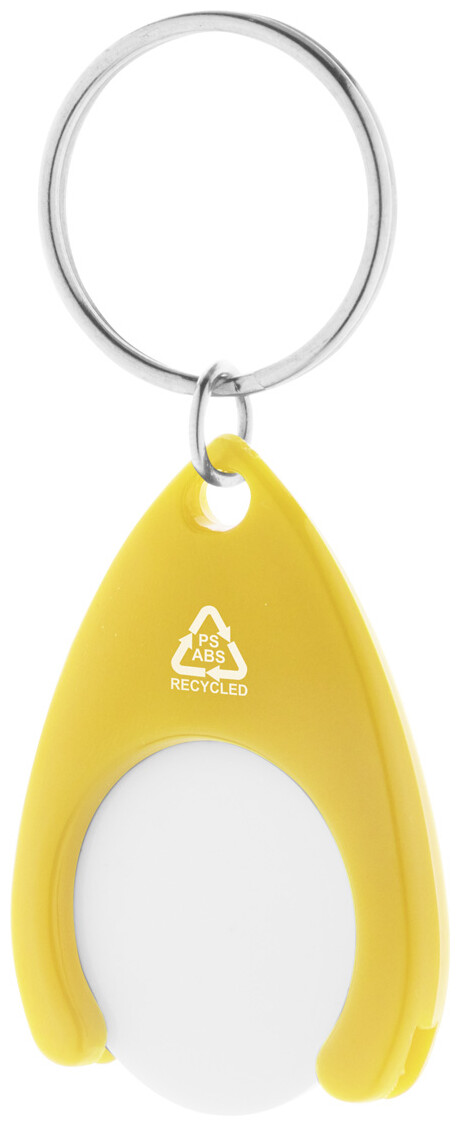 Přívěšek na klíče z recyklovaného ABS a recyklovaného plastu PS se žetonem do nákupního vozíku a kovovým kroužkem. Velikost mince: ø24×2 mm.