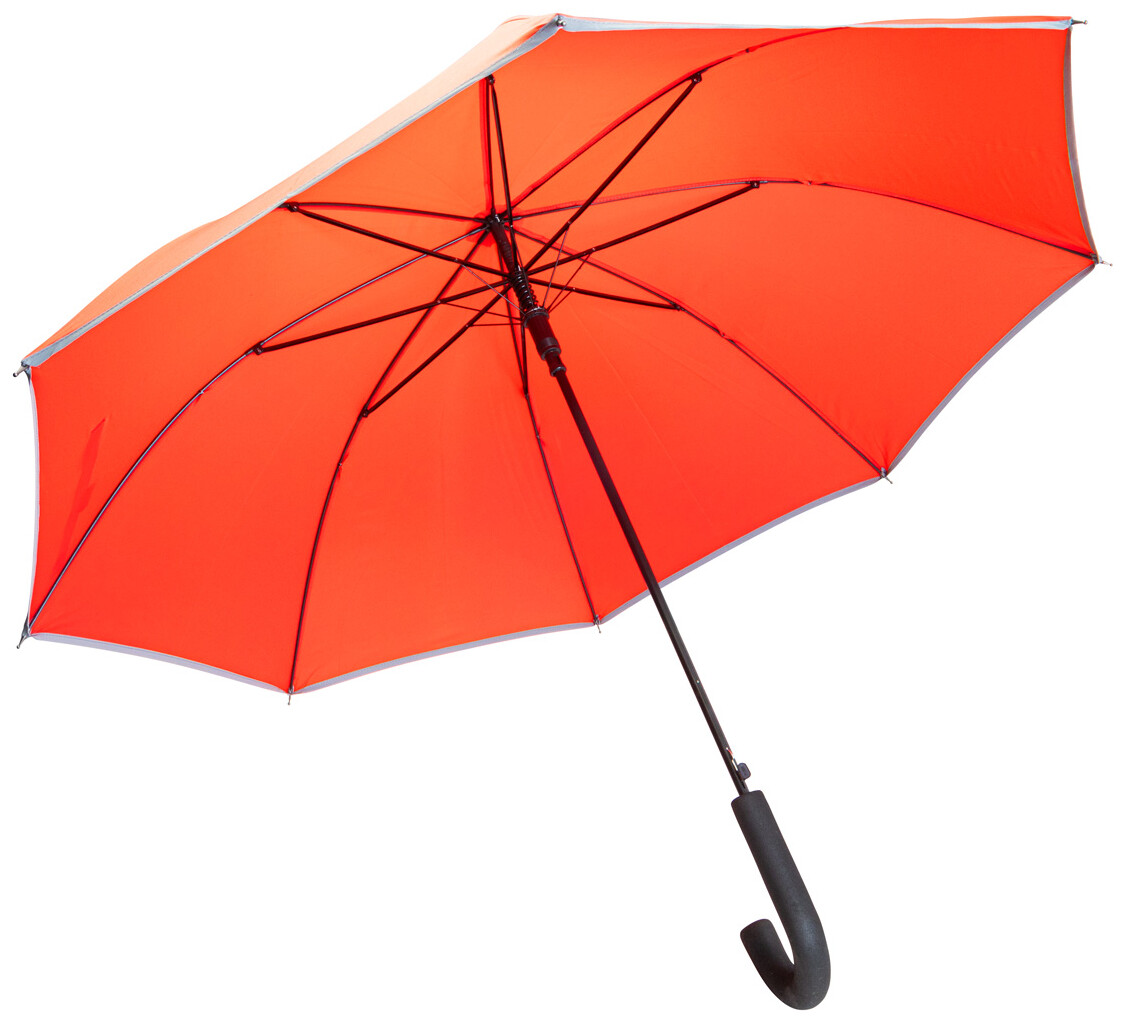 Automatický, větruodolný deštník s 8 panely a reflexním lemem. S kovovým rámem, sklolaminátovými žebry a EVA rukojetí. Pongee 190T RPET. S výrazným štítkem RPET. Pouze pro propagační účely se produkt nekvalifikuje jako osobní ochranný prostředek.