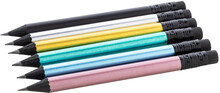 Černá dřevěná mini tužka v metalickém provedení s černou gumou. Ořezaná, třída HB.