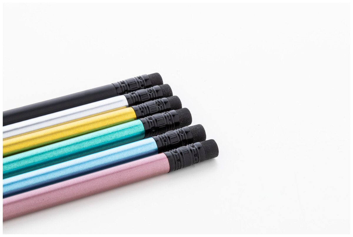 Černá dřevěná mini tužka v metalickém provedení s černou gumou. Ořezaná, třída HB.