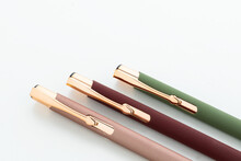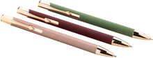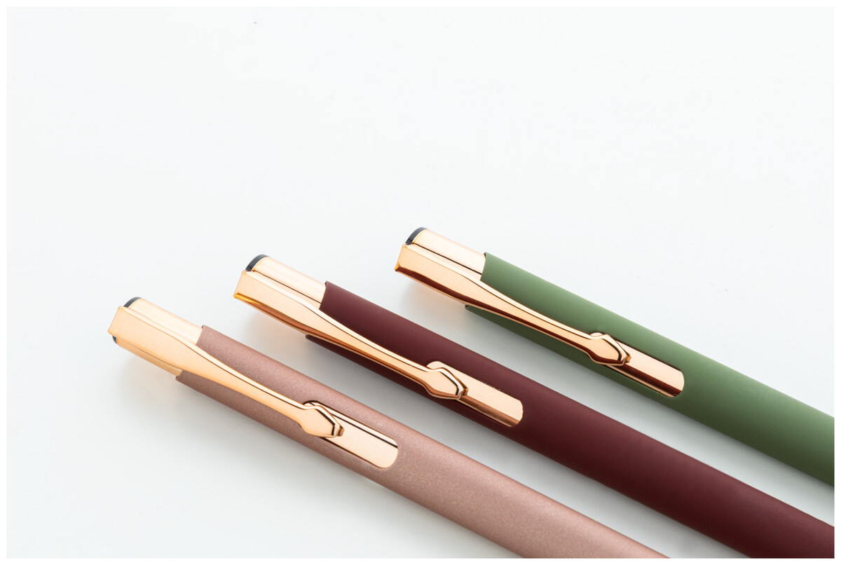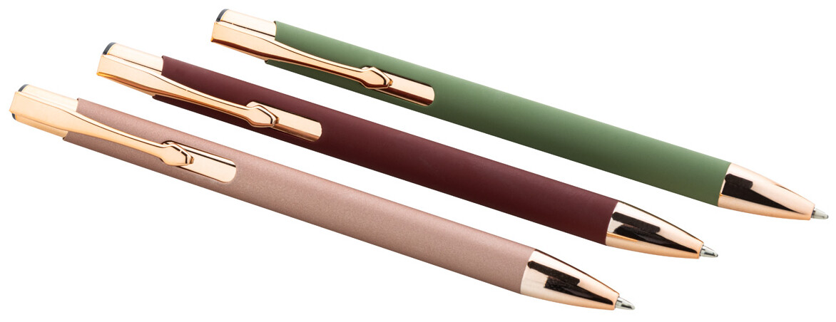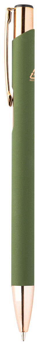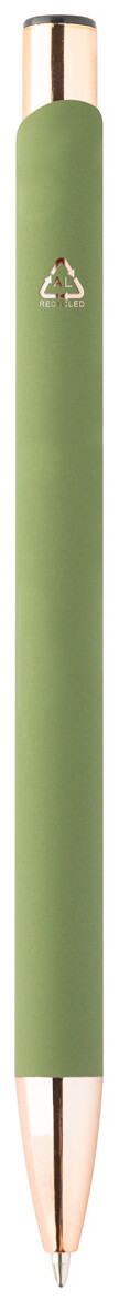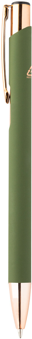 Kuličkové pero z recyklovaného hliníku s pogumovaným povrchem a detaily v barvě růžového zlata. Se speciální povrchovou úpravou pro zrcadlové laserové gravírování v barvě růžového zlata. S modrou náplní.