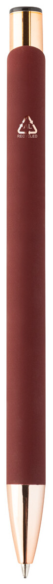Kuličkové pero z recyklovaného hliníku s pogumovaným povrchem a detaily v barvě růžového zlata. Se speciální povrchovou úpravou pro zrcadlové laserové gravírování v barvě růžového zlata. S modrou náplní.