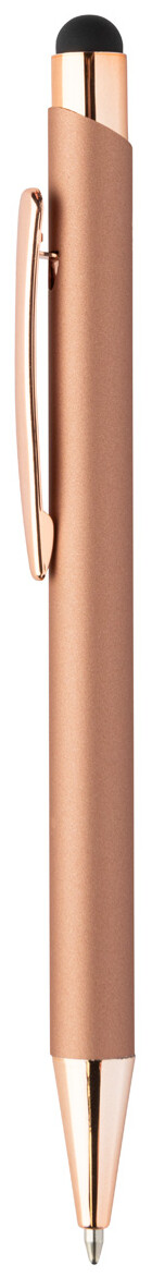 Kuličkové a dotykové pero z recyklovaného hliníku s pogumovaným povrchem a detaily v barvě růžového zlata. Se speciální povrchovou úpravou pro zrcadlové laserové gravírování v barvě růžového zlata. S modrou náplní.