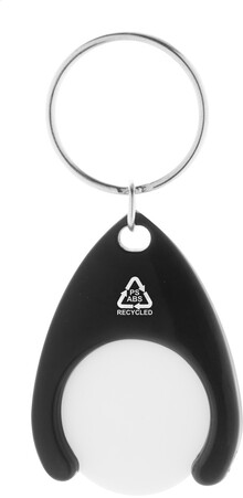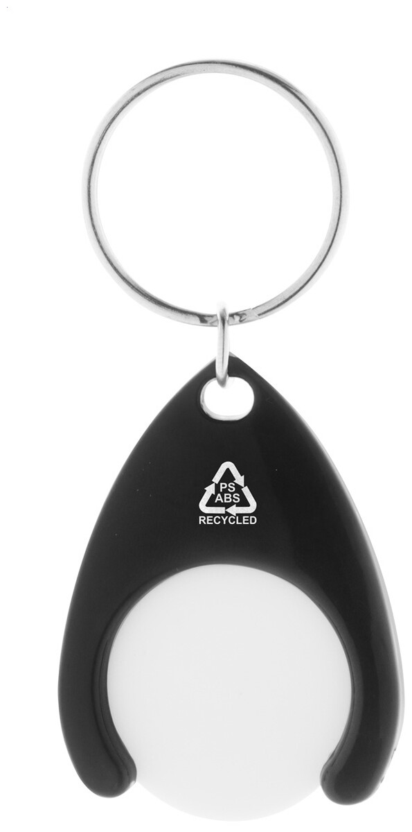 Přívěšek na klíče z recyklovaného ABS a recyklovaného plastu PS se žetonem do nákupního vozíku a kovovým kroužkem. Velikost mince: ø24×2 mm.