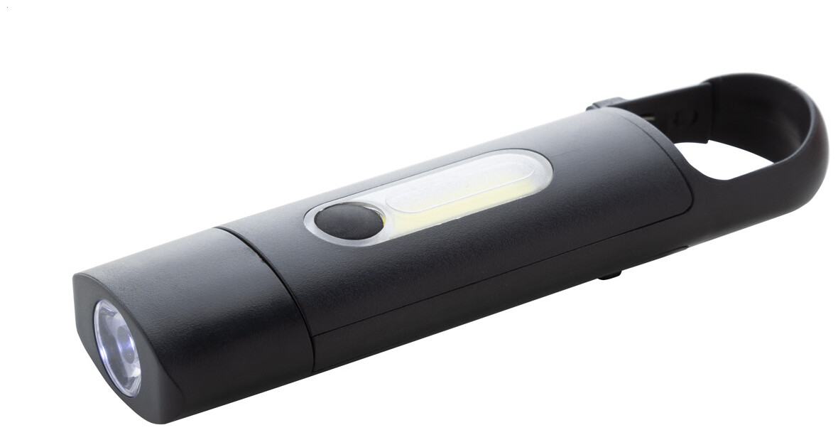 Recyklovaná ABS mini baterka s vestavěnou USB dobíjecí baterií (200 mAh) a karabinou. S COB světlem u písma a COB reflektorem na straně. Se 3 režimy svícení. Včetně USB nabíjecího kabelu.