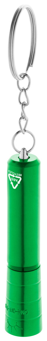Mini baterka s 1 LED, z recyklovaného ABS plastu s kovovým povrchem a kovovým kroužkem na klíče. S knoflíkovou baterií.