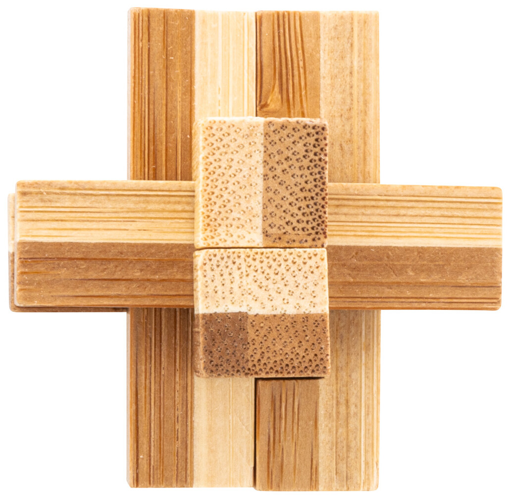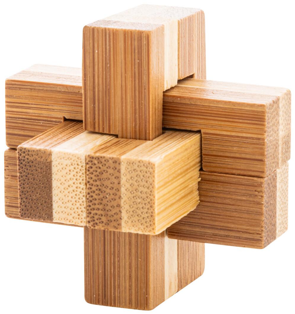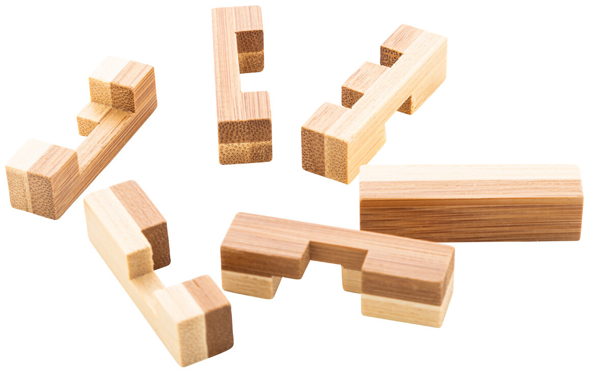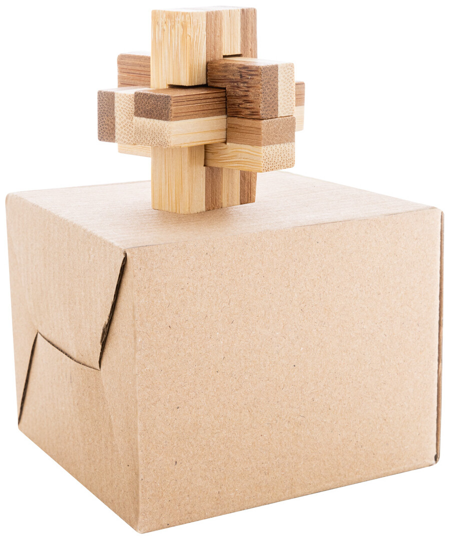 Bambusový hlavolam v kraftové papírové krabičce.