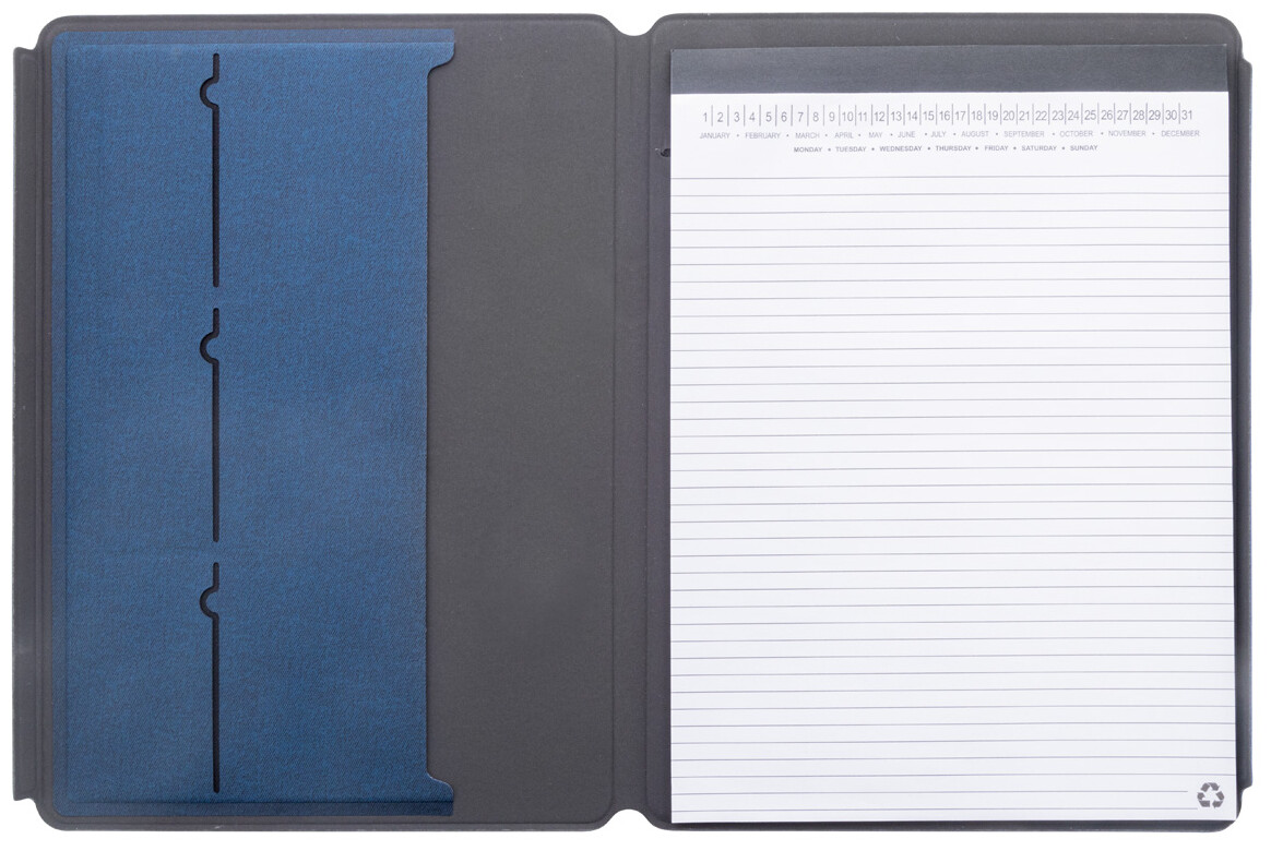 SlohaA4 na dokumenty z recyklované PU kůže s vnitřními kapsami na organizér a magnetickým zavíráním. S 20 linkovanými listy poznámkového bloku z recyklovaného papíru.