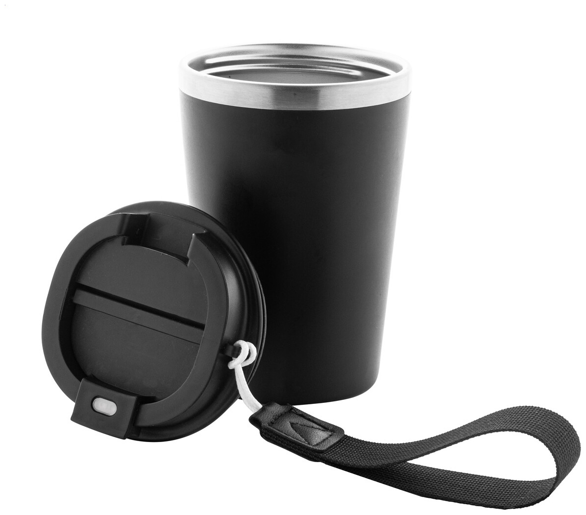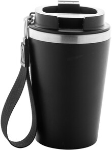 Dvoustěnný termo hrnek z recyklované nerezové oceli s vnějším PP plastem a víčkem na pití. S popruhem na přenášení RPET. 350 ml.