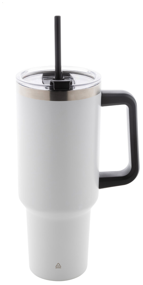 Dvouplášťový vakuově izolovaný termo hrnek z recyklované nerezové oceli s PS víčkem na pití a PP brčkem. 1200 ml.