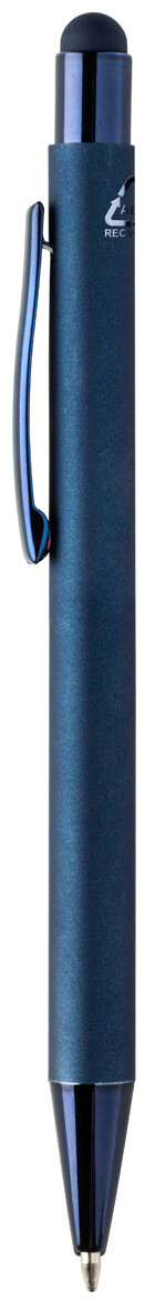 Recyklované hliníkové kuličkové a dotykové pero s pogumovaným tělem a barevnými lesklými kovovými částmi. Se speciální vrstvou pro zrcadlové gravírování odpovídající kovovým částem. S modrou náplní.