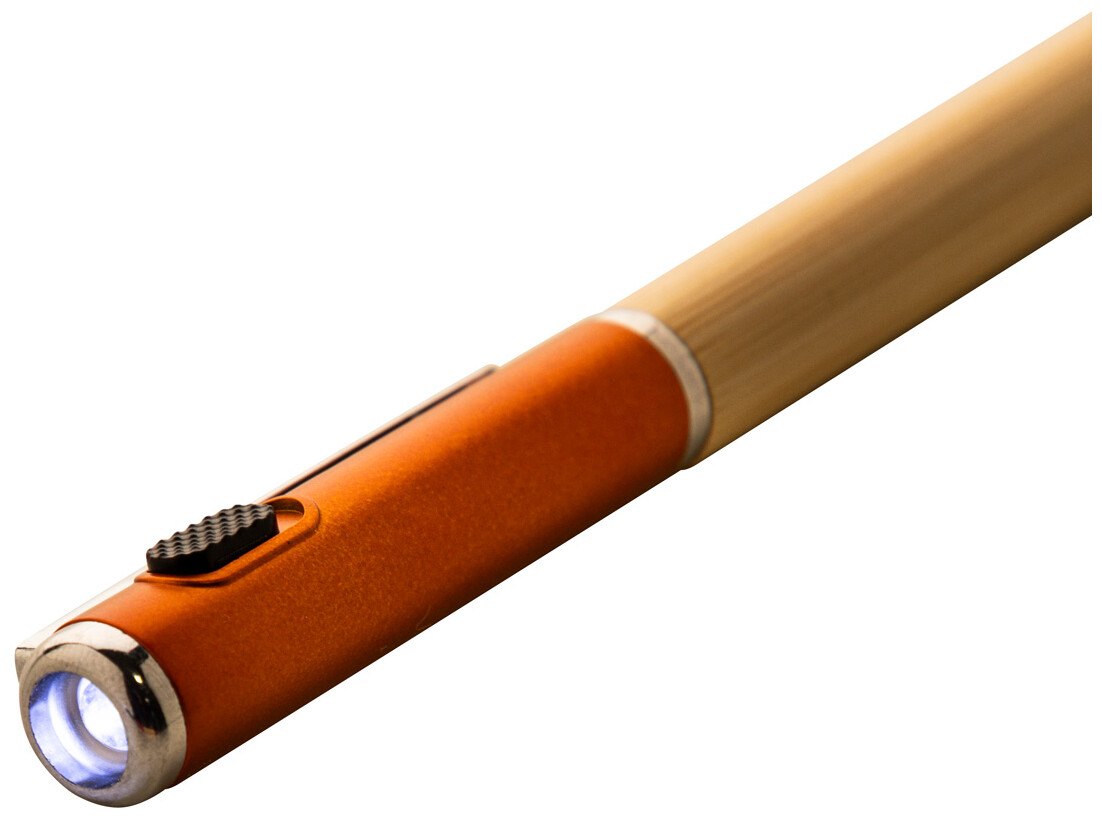 Kuličkové pero z bambusu a recyklovaného ABS plastu s 1 LED svítilnou. S modrou náplní a knoflíkovou baterií.