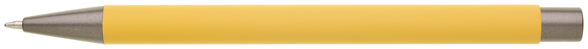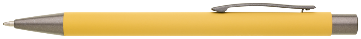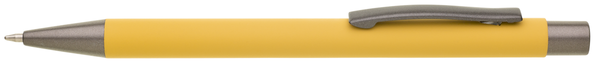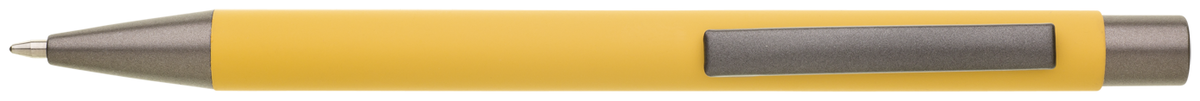 Kovová propiska CAGERI SOFT s hnědo-černými doplňky, s žlutým pogumovaným povrchem. Velkoobsahová modrá náplň.
