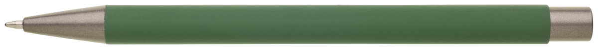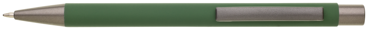 Kovová propiska CAGERI SOFT s hnědo-černými doplňky, se zeleným pogumovaným povrchem. Velkoobsahová modrá náplň.