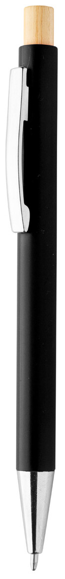 Kuličkové pero z recyklovaného ABS plastu s bambusovým tlačítkem a kovovým klipem. S modrou náplní.