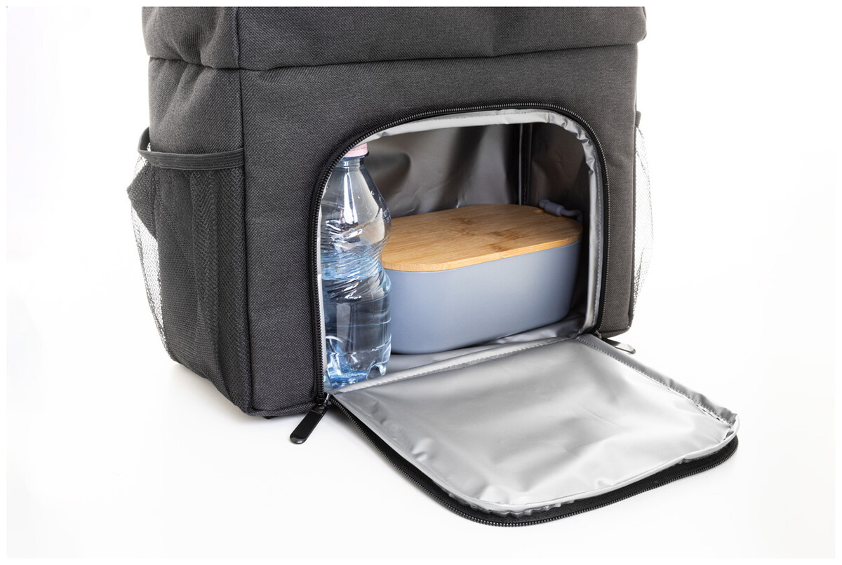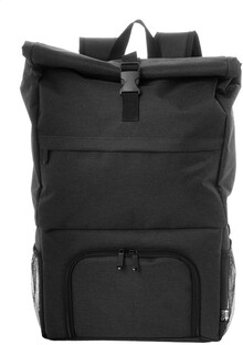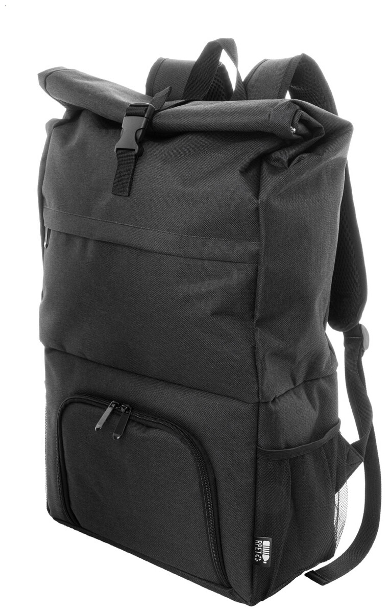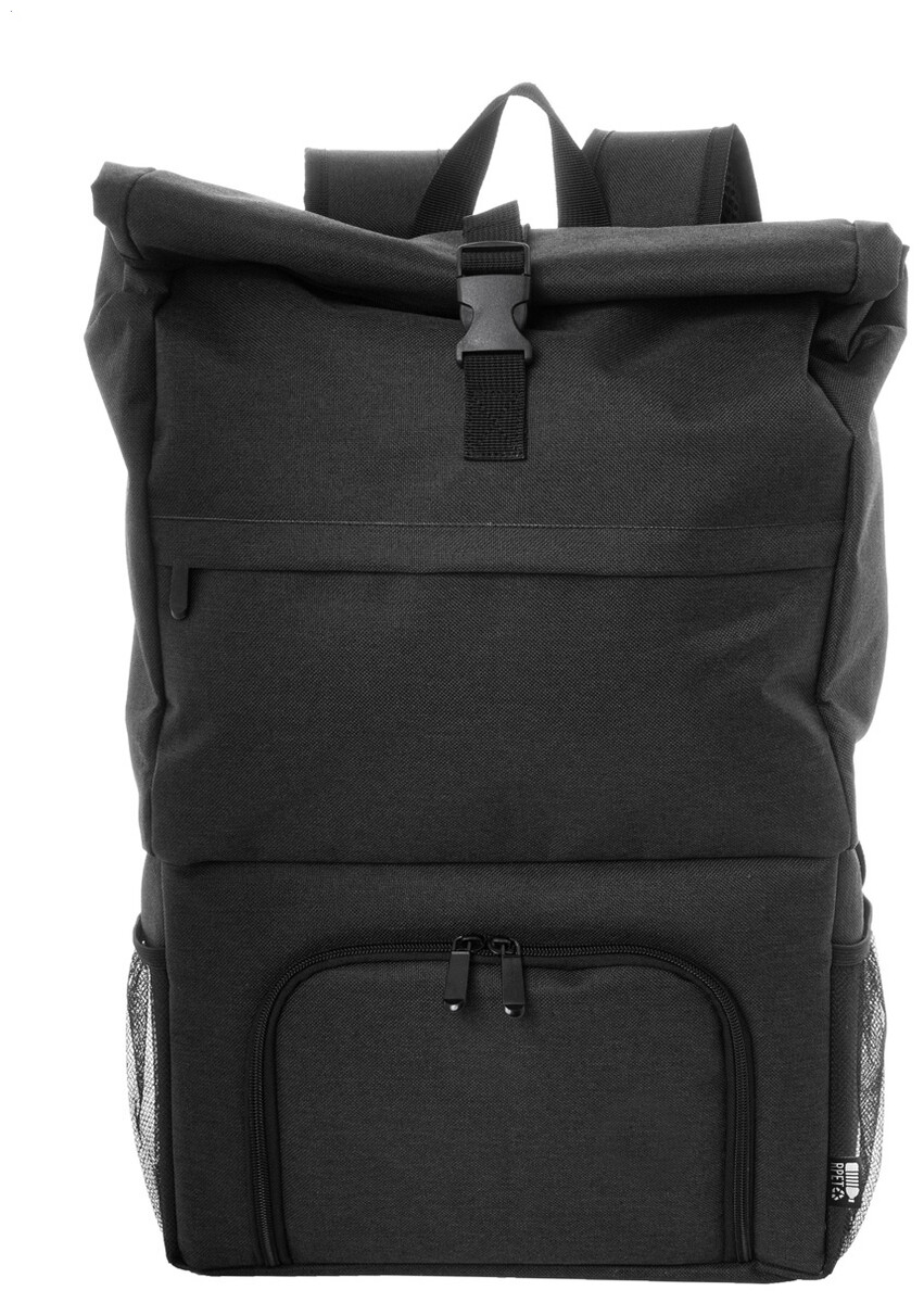 Rolltop RPET chladící batoh s PEVA polstrovanou chladicí přihrádkou na zip na jídlo. S hlavní přihrádkou na sponu, přední kapsou na zip, bočními síťovanými kapsami a polstrovanými ramenními popruhy. 600D RPET polyester s výrazným štítkem RPET.