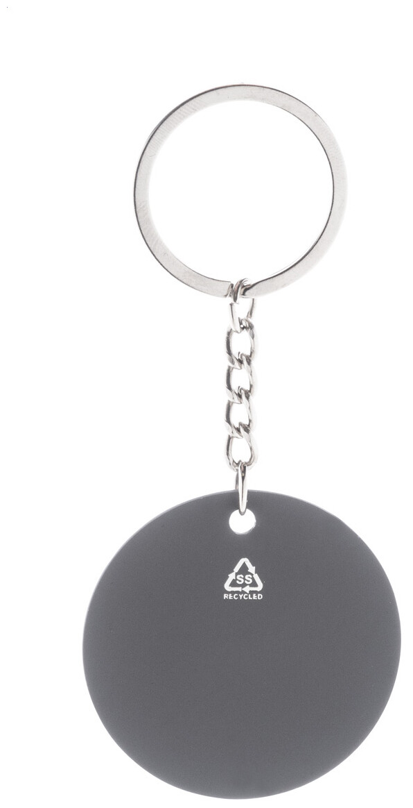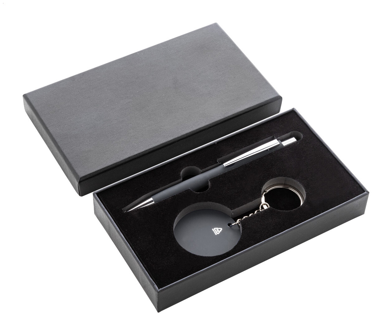 2dílná dárková sada v černé papírové dárkové krabičce. Včetně kuličkového pera z recyklovaného hliníku s pogumovaným povrchem a modrou náplní a přívěsku na klíče z recyklované nerezové oceli s pogumovaným povrchem. Obě položky mají speciální povrchovou úpravu pro zrcadlové laserové gravírování.