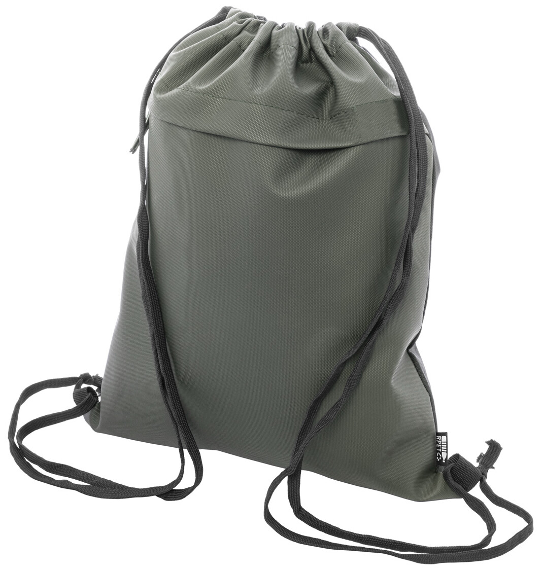 RPET vak se stahovací šňůrkou,s přední stranou potaženou PU a přední kapsou na zip. Polyester 600D RPET potažený PU s výrazným štítkem RPET.