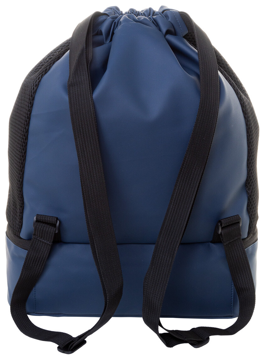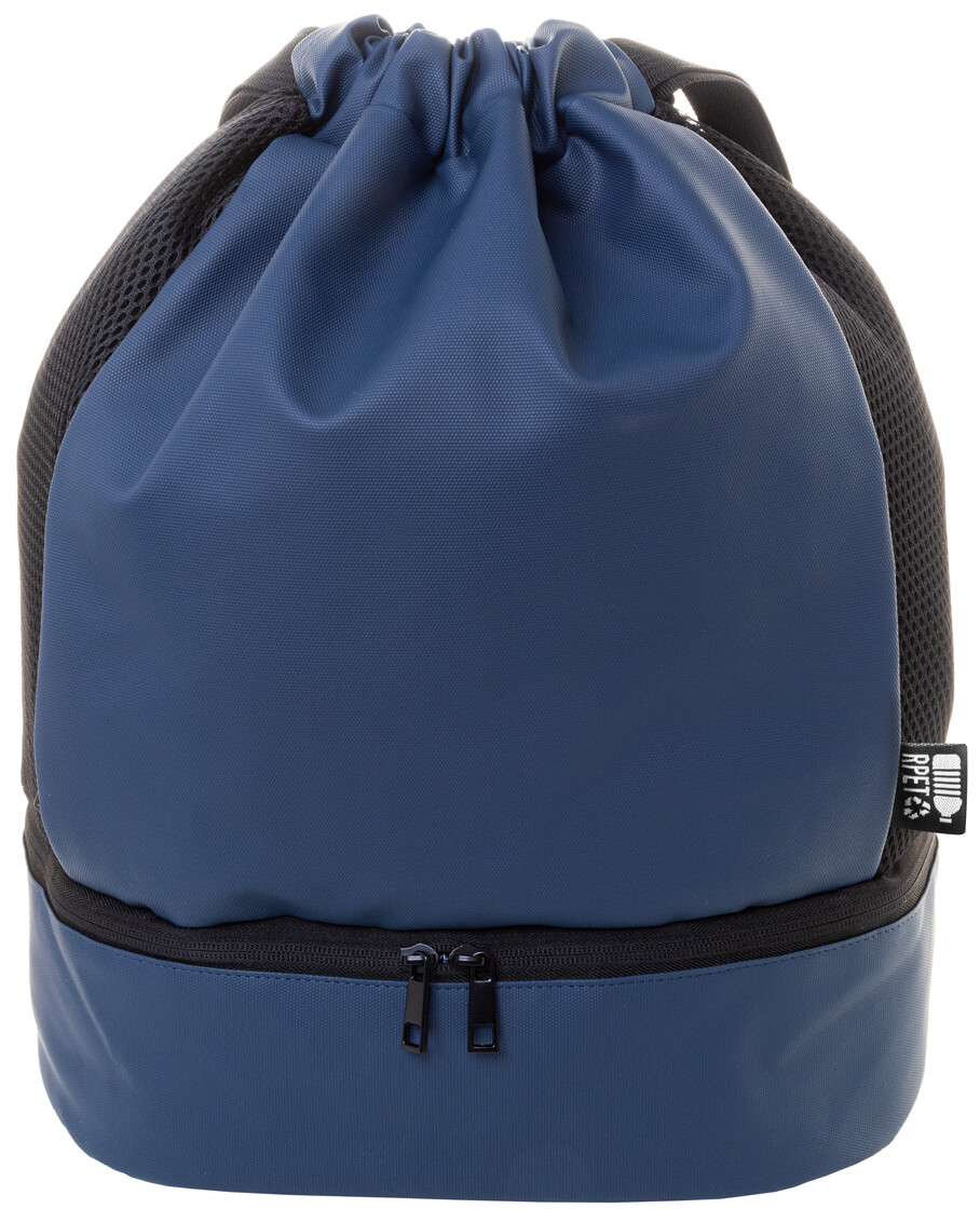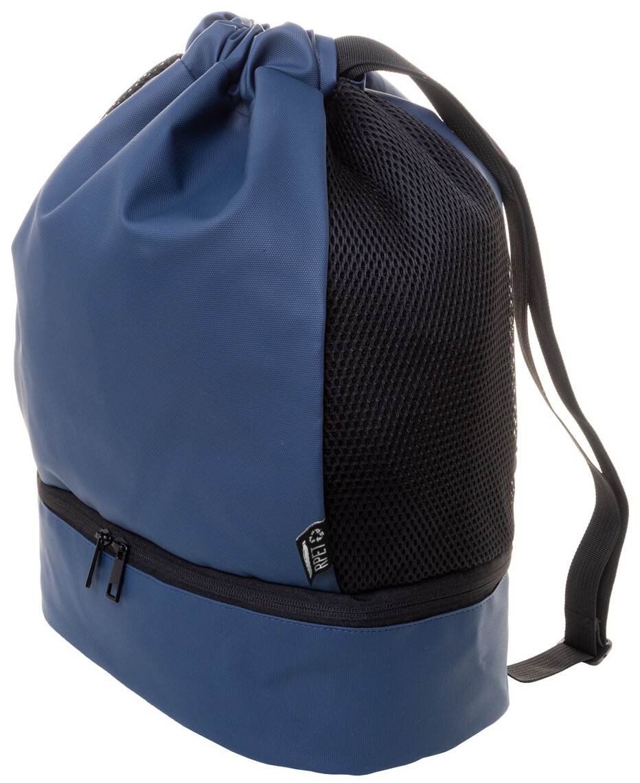 Prémiový vak se stahovací šňůrkou z RPET s přihrádkou na boty na zip, bočními vložkami ze síťoviny a širokými popruhy. Polyester 600D RPET potažený PU s výrazným štítkem RPET.