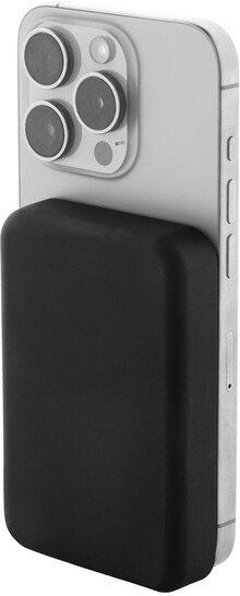 Power banka z recyklovaného ABS s 5000 mAh baterií a vestavěnou magnetickou bezdrátovou nabíječkou (5W). Se vstupem USB-C a portem pro nabíječku. Včetně samolepícího kovového kroužku pro použití magnetické funkce na jakémkoli bezdrátově nabíjecím zařízení. Kompatibilní s iPhone® 12 nebo novějším. Včetně USB nabíjecího kabelu.