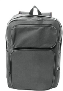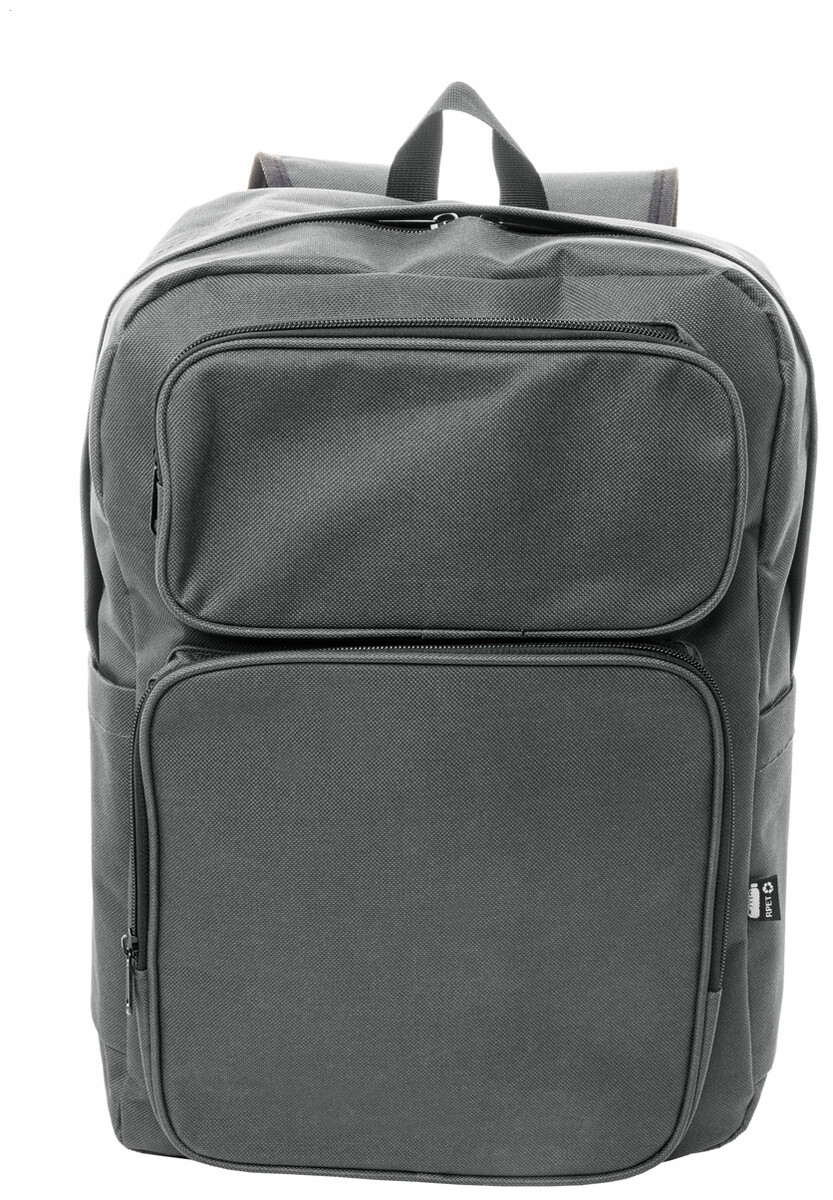 Batoh RPET s hlavním oddílem na zip, 2 předními kapsami na zip, bočními kapsami a polstrovanou přihrádkou na notebook (15") a tablet (10") S polstrovanými zády a ramenními popruhy. Polyester 600D RPET, s výrazným štítkem RPET.