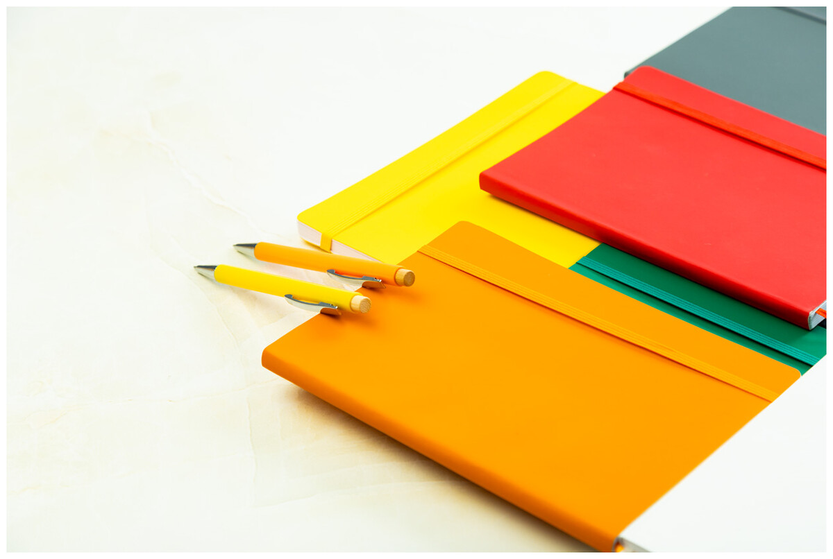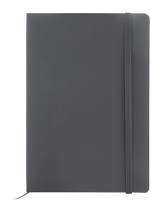 Blok A5 z recyklované PU kůže s měkkou vazbou s 80 linkovanými listy z recyklovaného papíru. Se záložkou v odpovídající barvě a gumičkou.