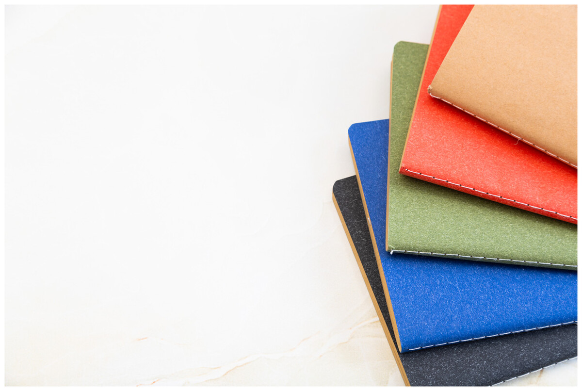 Blok A5 potažený recyklovaným papírem se šitými deskami a 60 linkovanými listy z recyklovaného kraftového papíru.