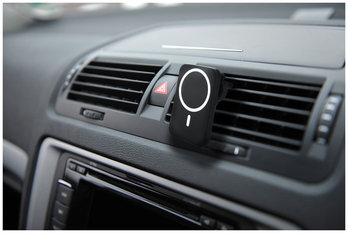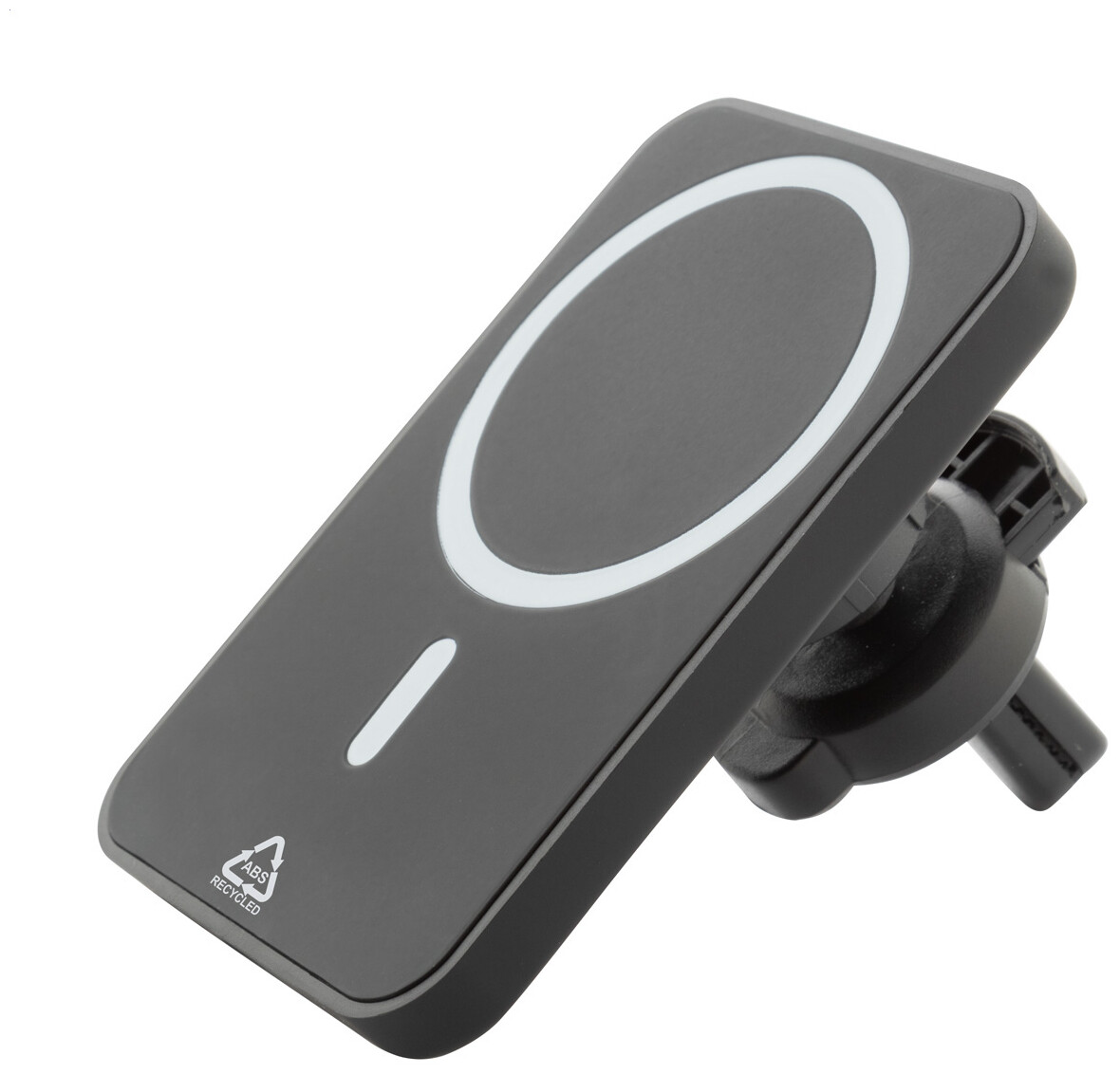Magnetický držák na mobil do auta v recyklovaném ABS pouzdru s vestavěnou bezdrátovou rychlonabíječkou (15W) a nastavitelným upevněním do větracího otvoru. Včetně samolepícího kovového kroužku pro použití magnetické funkce na jakémkoli bezdrátově nabíjecím zařízení. Kompatibilní s iPhone® 12 nebo novějším. Včetně USB nabíjecího kabelu.