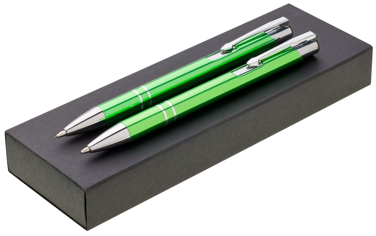 Sada ORIN světle zelená, tužky jsou vyrobeny z hliníku, na těle mají 2 stříbrné proužky a doplňky. Dodávají se v papírové krabičce.