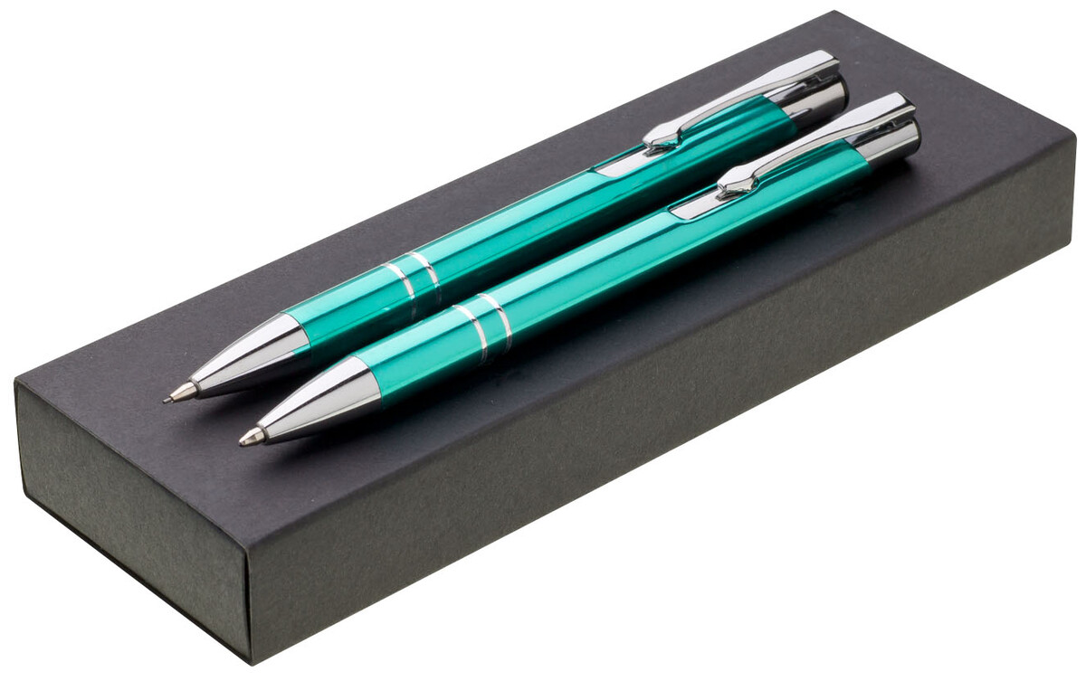 Sada ORIN zelená mint, tužky jsou vyrobeny z hliníku, na těle mají 2 stříbrné proužky a doplňky. Dodávají se v papírové krabičce.